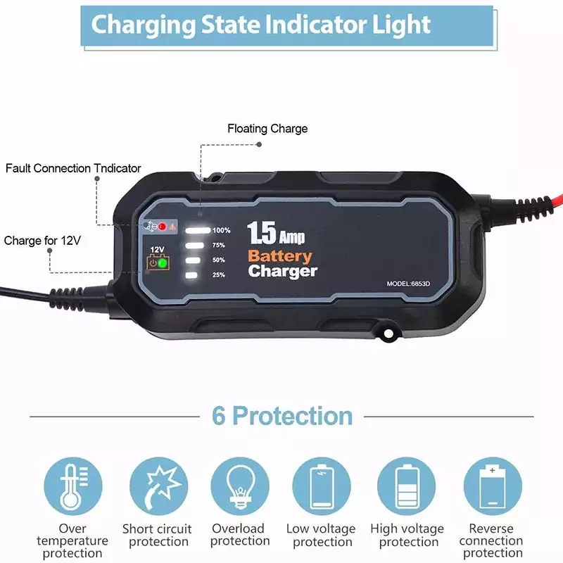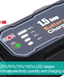 Chargeur 12V 1,5A intelligent avec LED et maintien automatique. Idéal pour motos, voitures, camping-cars et batteries en stockage prolongé.
